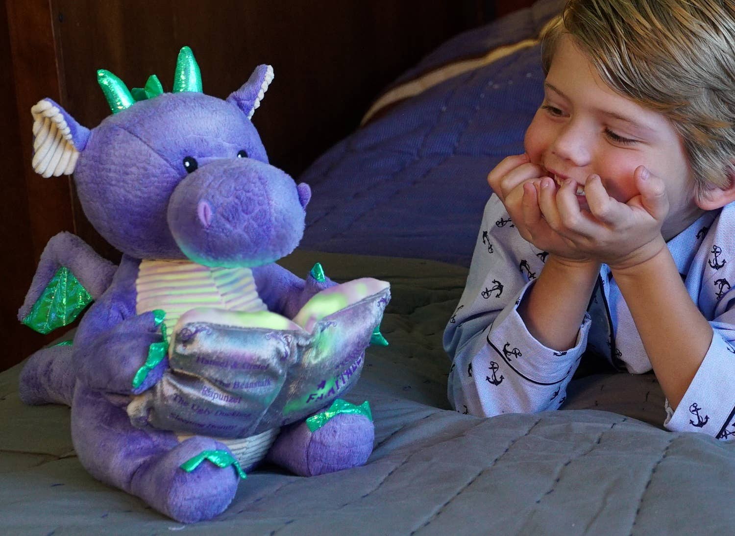 This 12" Dalton the Storytelling Dragon recites 5 different classic fairytales including Hansel and Gretel, Jack and the Beanstalk, Rapunzel, the Ugly Duckling, and Sleeping Beauty. His book features soft changing color lights as he recites the stories.