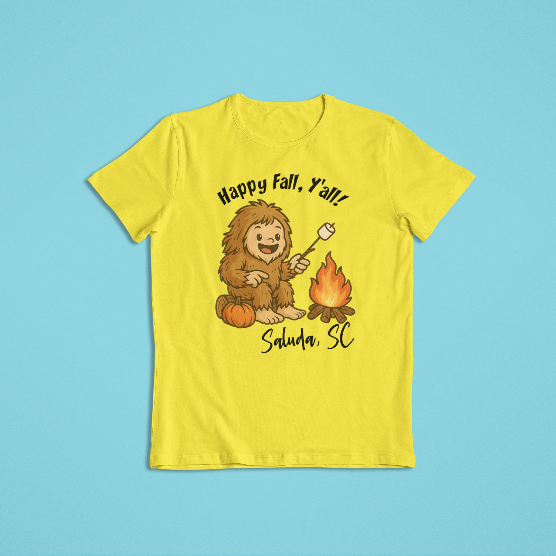 Design features a happy sasquatch roasting a marshmallow over a campfire. Words read "Happy Fall Y'all"