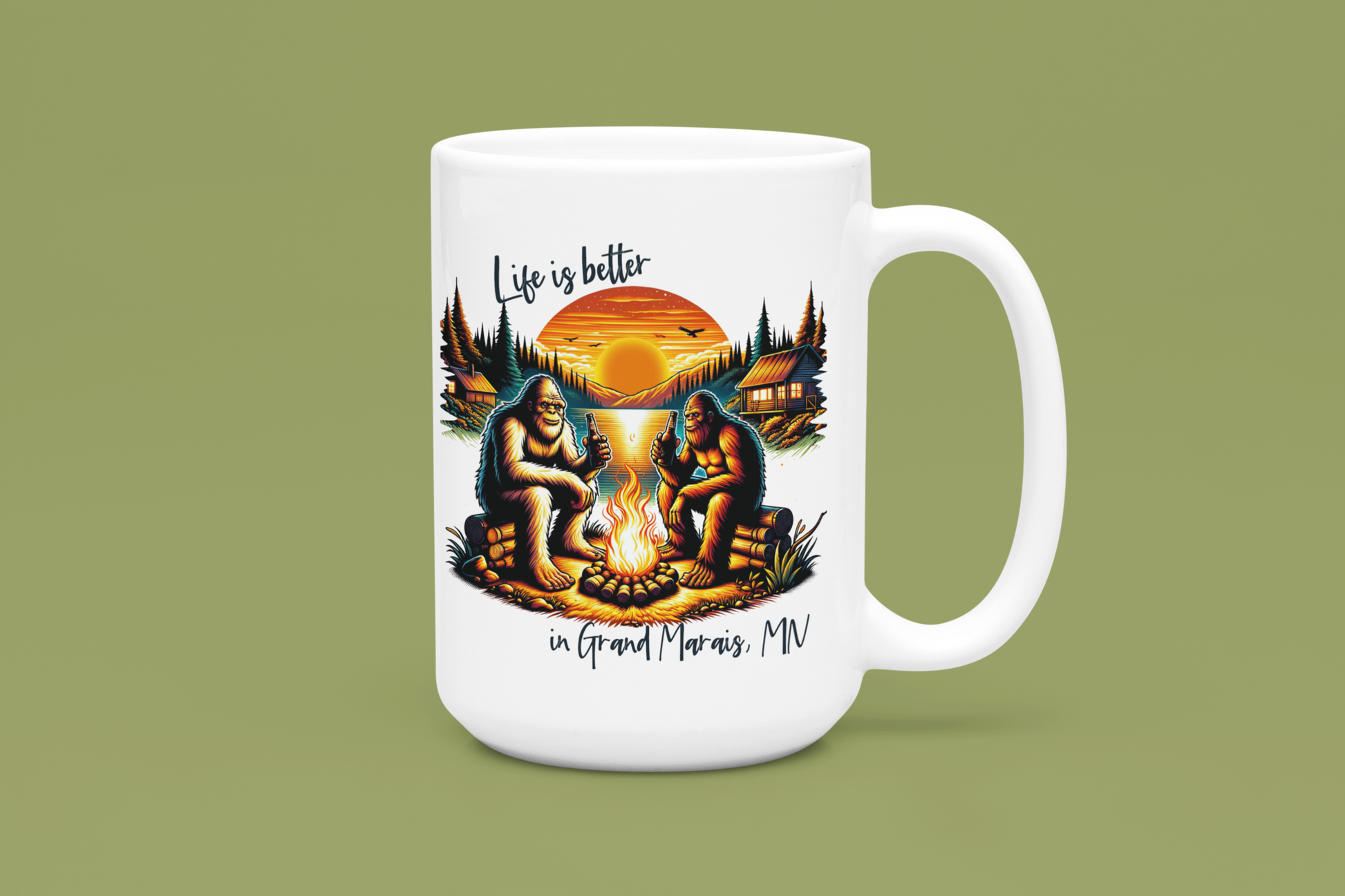 This mug displays two Sasquatches relaxing at a campfire. Words read "Life is better in [INSERT YOUR LOCATION]"